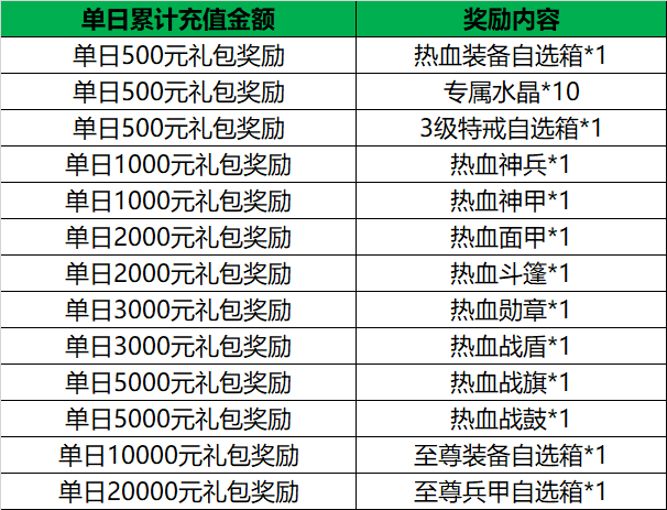 2.根据玩家前一日累计充值金额,可以在对应的累充档位里自选一档礼包进行发放