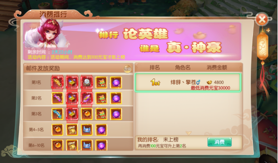 活动介绍:活动期间内玩家累计消费达到一定排名即可获得极品大奖,前三名可以获得天地神盒和极品称号等奖励
