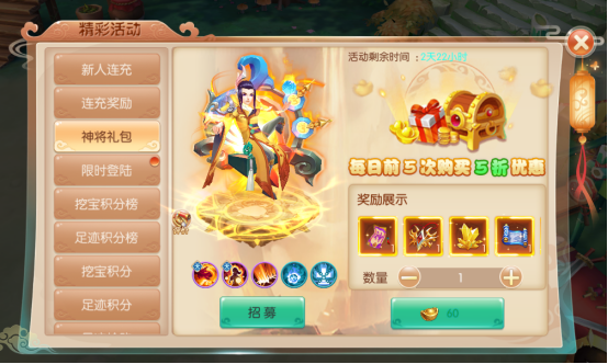 活动介绍:购买神将礼包可以获得神将寻宝券,用于在神将转盘抽取最强神将周瑜。礼包每天前五次购买半价!