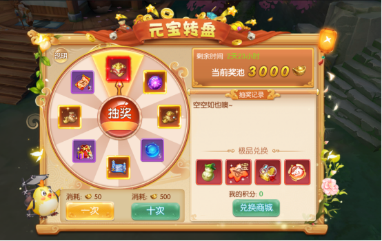 4、每次抽奖将获得1积分,可以在积分商店兑换人参果、红色宝物碎片等极品道具!