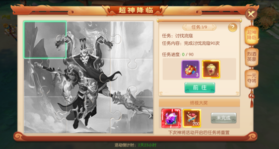 活动介绍:活动期间,完成拼图任务集齐神将关羽完整图像可以获得丰厚奖励!更可以获得美酒,用于向关羽敬酒获得好感度,好感度满后即可获得关羽!