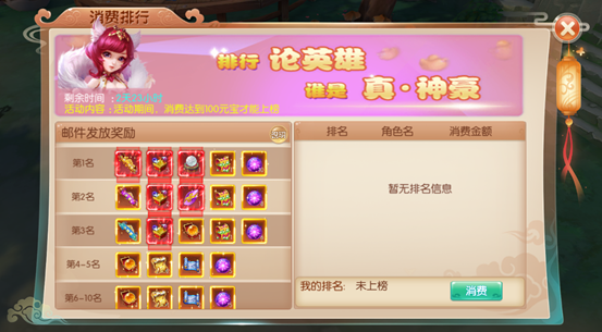 活动介绍:活动期间内玩家累计消费达到一定排名即可获得极品大奖,前三名可以获得天地神盒和极品称号等奖励