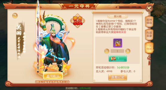 活动介绍:活动期间可以花费10元宝参与神将抽奖活动,每期将随机抽取1位幸运观众获得超级神将关羽!具体活动详情见游戏内。
