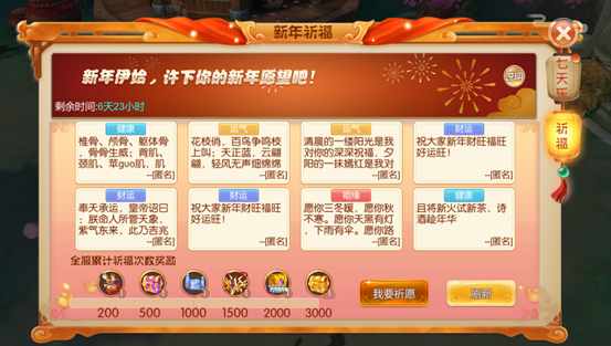 1.新的一年祈福求愿,全服务器祈福达到一定次数全服玩家都可领奖!