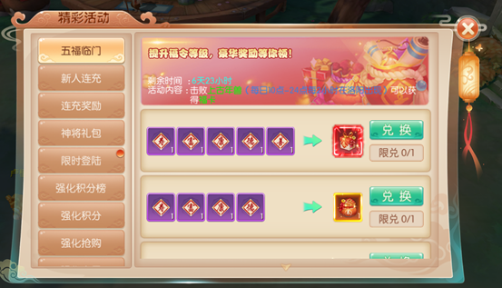 2.每次祈福消耗一张“祈福令”,并且可以获得一张福卡,可在五福降临中兑换奖励。