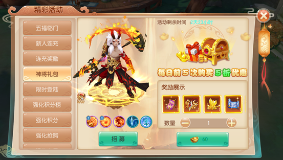购买神将礼包可以获得神将寻宝券,用于在神将转盘抽取最强神将-魔·马超。礼包每天前五次购买半价!