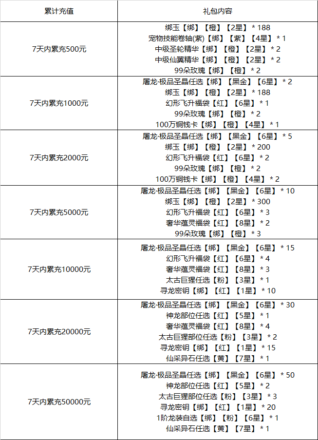 活动规则:玩家在活动期间,7天内累充达到对应档位,即可领取奖励;各档位奖励仅限领取1次,可叠加领取;