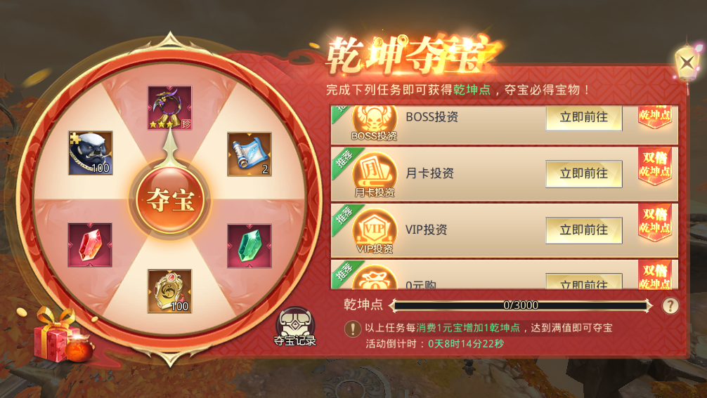 活动期间,完成相应任务即可获得乾坤点,夺宝必得宝物。