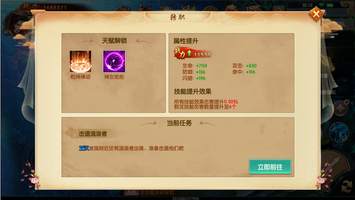 角色达到一定等级后可接到转职任务,完成一系列转职任务后,可获得大量属性增益,并解锁一层新的天赋。点击屏幕上方的“转职”按钮,在弹出界面上部分可查看成功转职后所解锁的天赋技能、获得的属性提升,在下部分可查看转职任务详情。点击界面右下角的“立刻前往”按钮,便可进行转职任务。