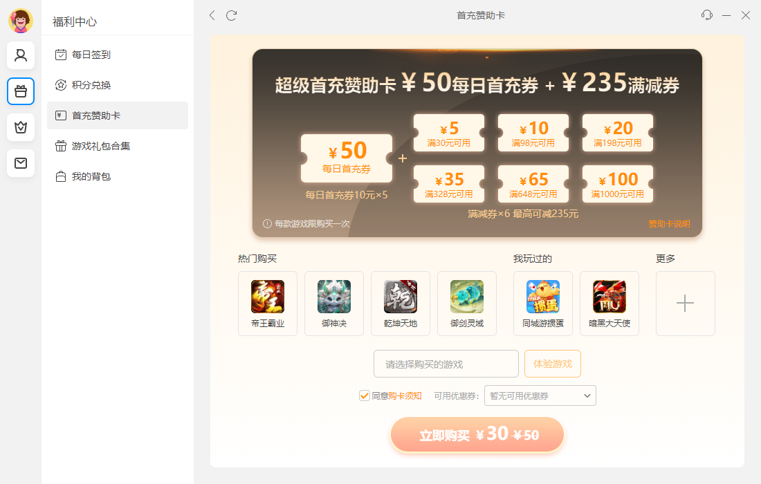 注:每款游戏赞助卡,一个账号仅限购一次,且优惠券与礼包福利仅限当前游戏使用。