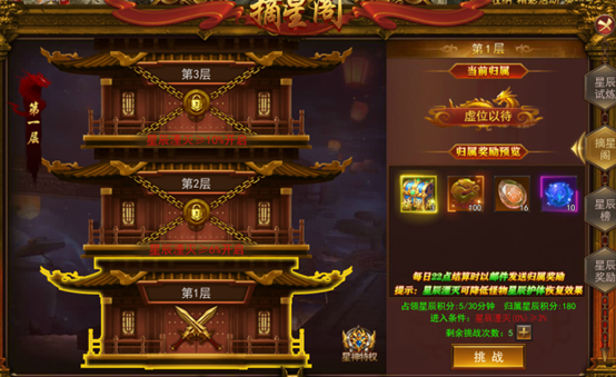 (2)占领的摘星搁层数越高,获取的积分越高(同样击杀星辰试炼层数越高B0SS,积分越高,若是激活星辰特权后,可额外获得积分20%)