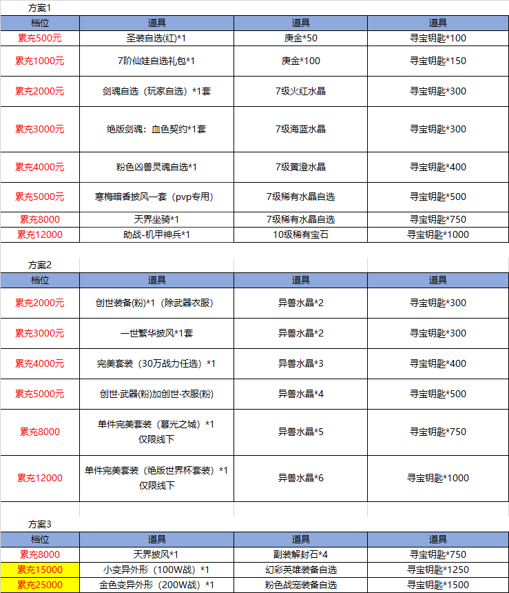 注意事项:1、当充值额度达到相应档位后,可自行选择方案,申请相应档位礼包。 ————举例:玩家在活动期间充值达到1600元,可申请1600元档位礼包,其他档位无法申请.