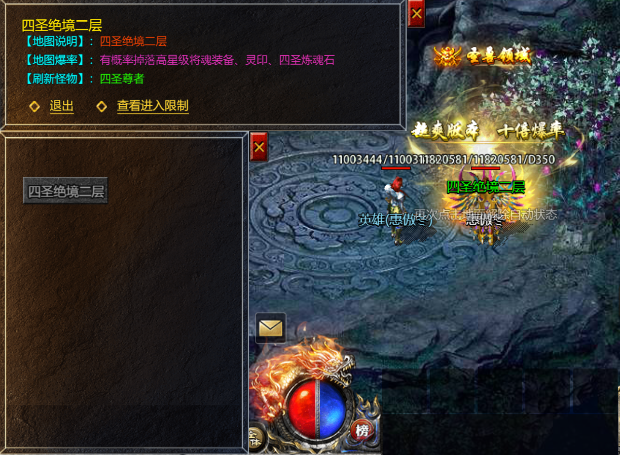 - 四圣绝境二层为跨服地图,死亡掉落为常规地图的1/3