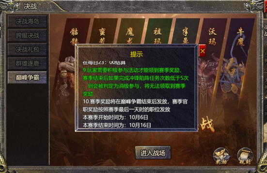 - 期间尽情提高巅峰争霸中的战力吧,活动结束会根据官职和阵营排行发放丰厚的奖励