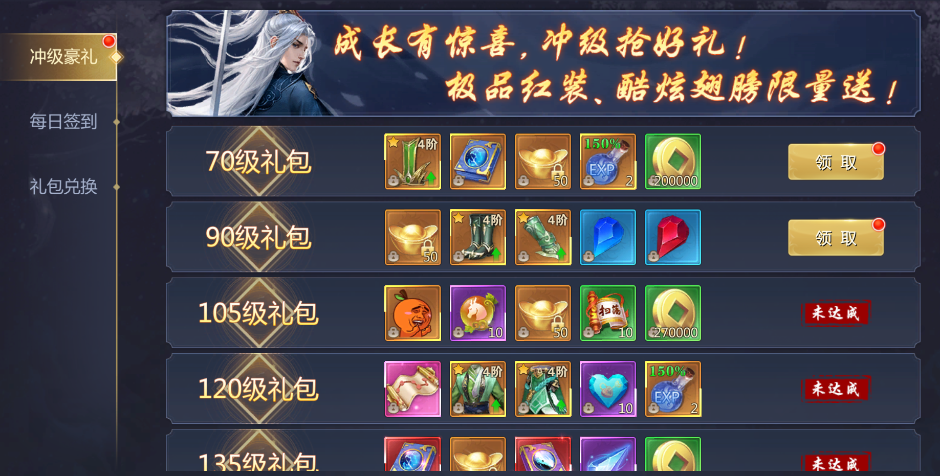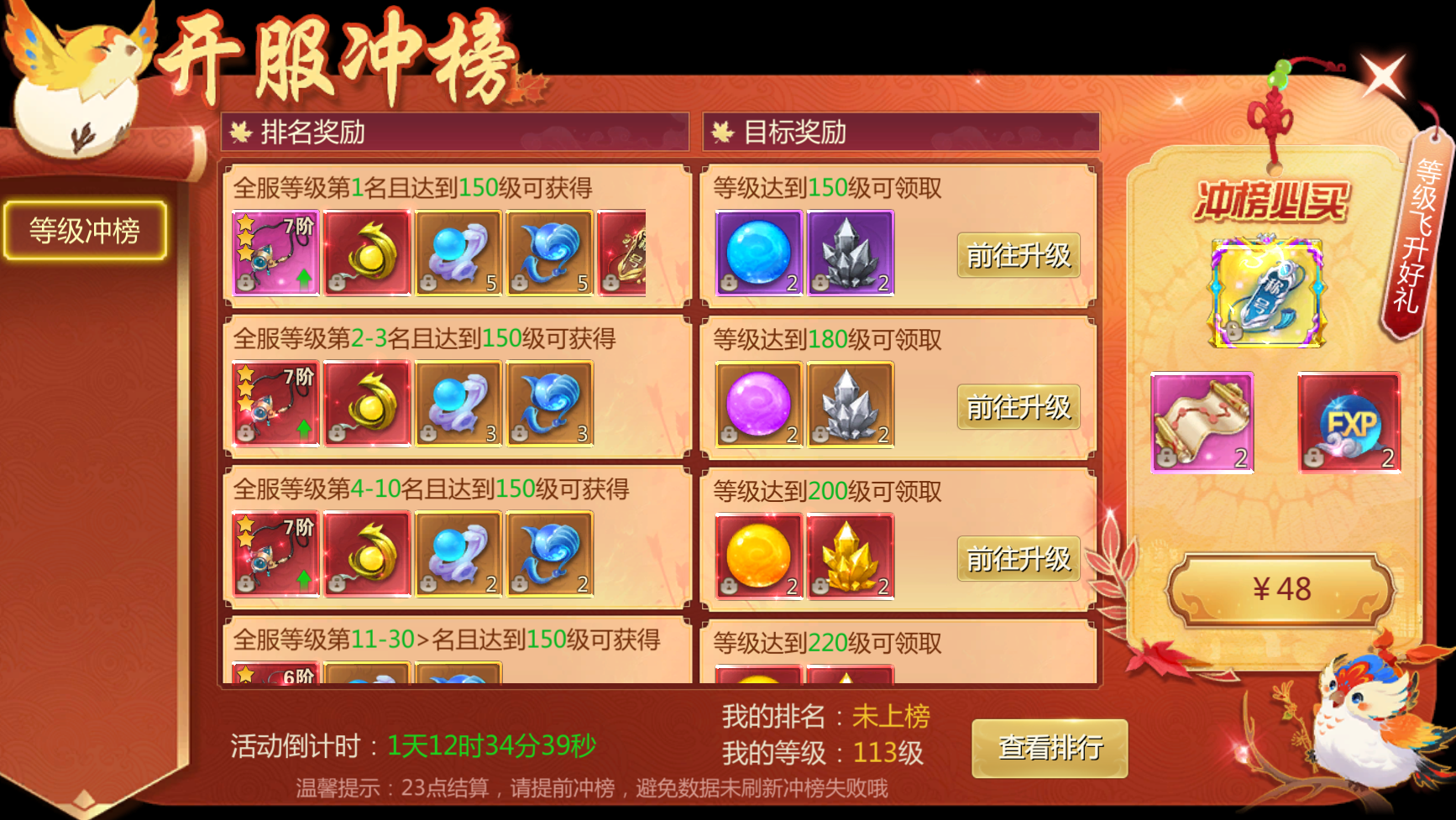 活动规则:创角后开启冲级豪礼活动,每达到对应等级即可领取丰厚奖励