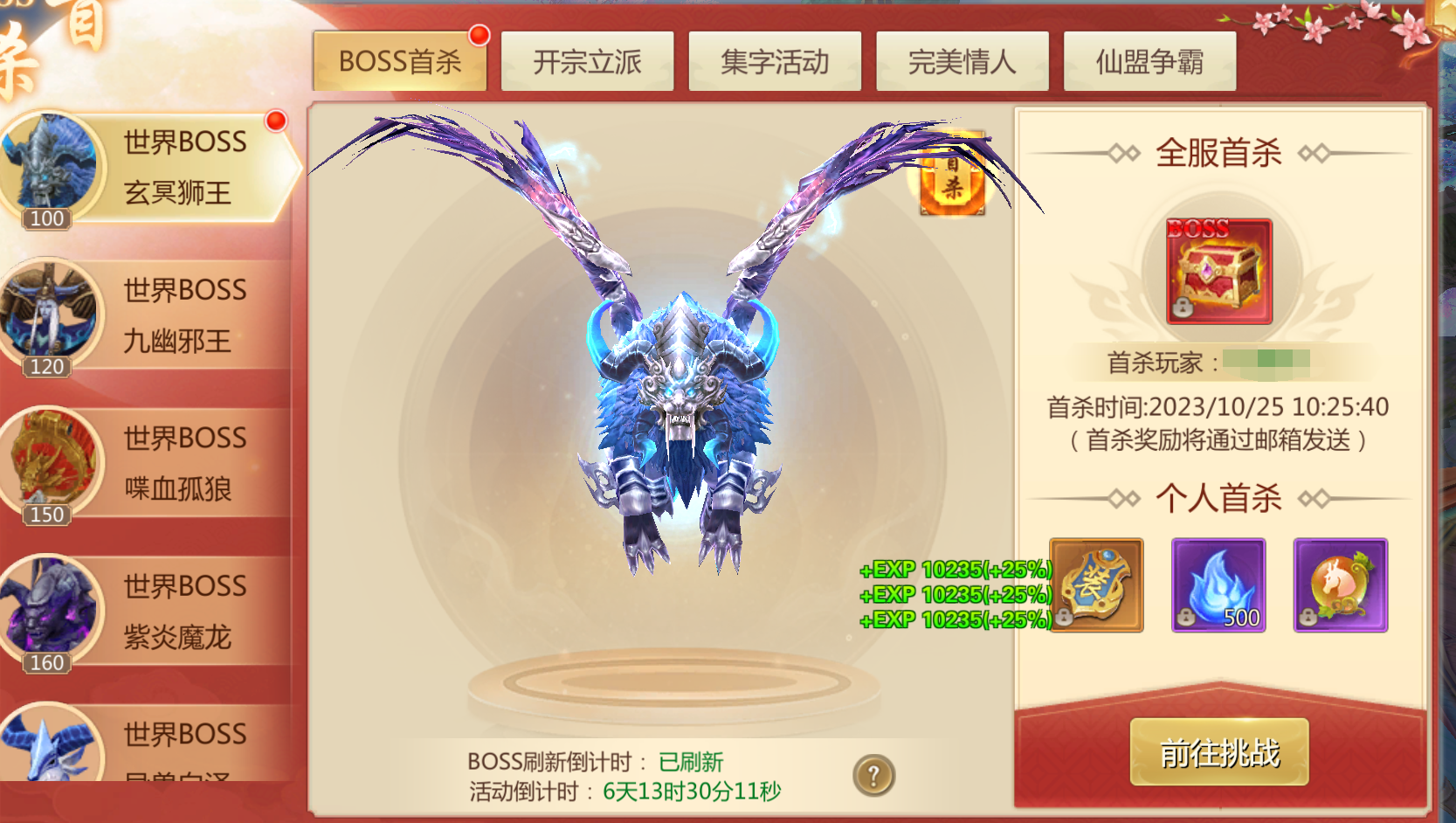 活动规则:活动期间内首服击杀可领取丰厚奖励,个人首杀也可领取奖励!