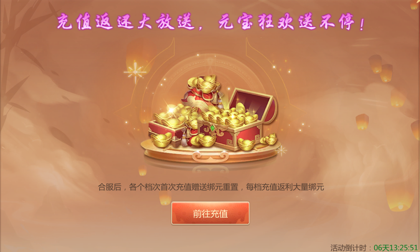 活动规则:合服后各档首充赠送绑元重置。