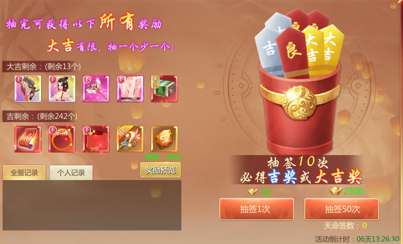 活动规则:活动期间可消耗元宝抽取包括桃花弄元宵,天命兑换卷在内的丰厚奖励。
