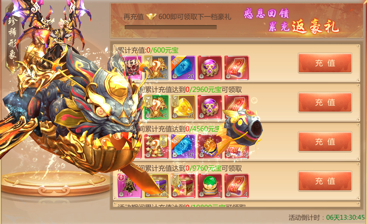 活动规则:活动期间累计充值达标即可领取对应档位奖励,更有稀有坐骑等你来拿!