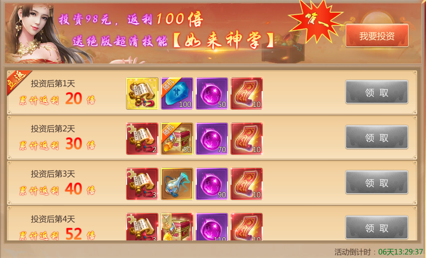 活动规则:活动期间投资98元即可获取100倍返利,更送稀有技能!
