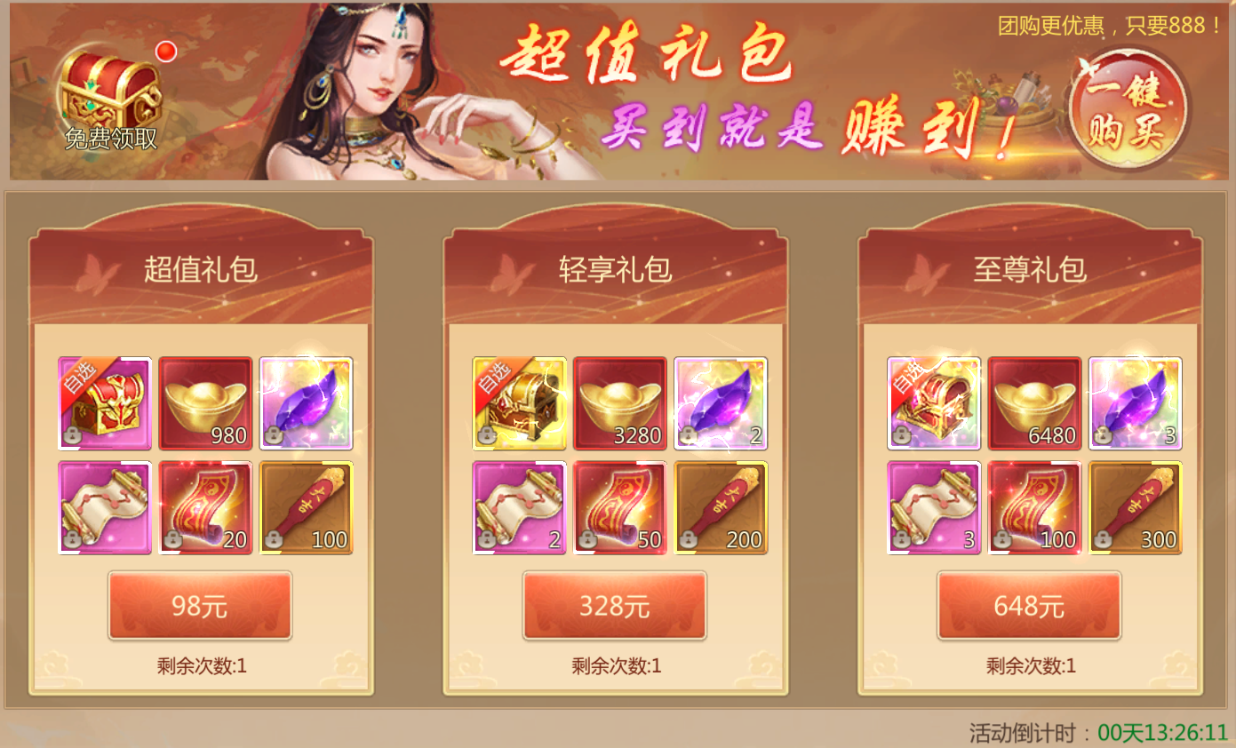 活动规则:活动期间可购买直购礼包,更可一键购买享优惠!