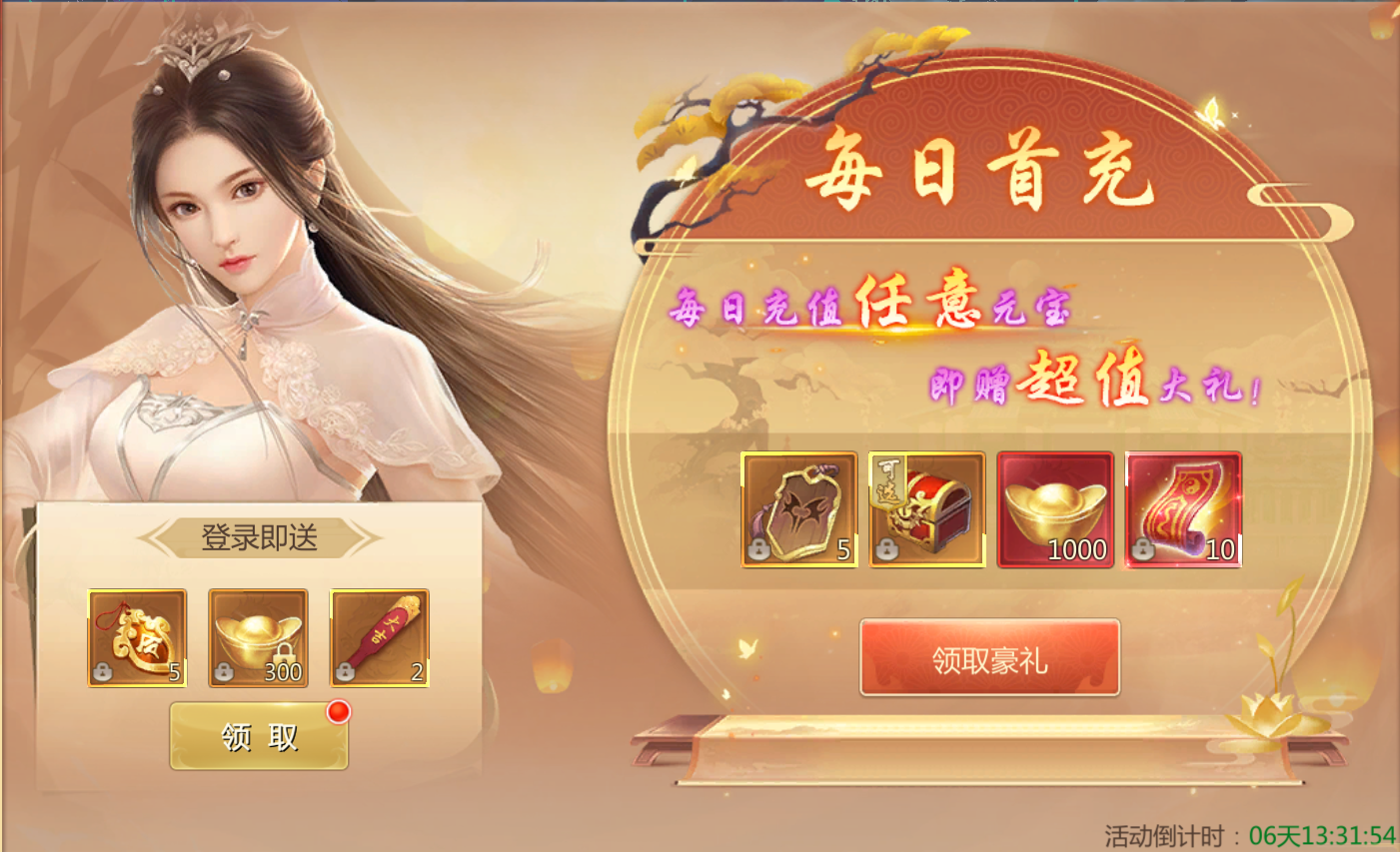 活动规则:活动期间登陆即可领取奖励,每日充值还可额外领取奖励。