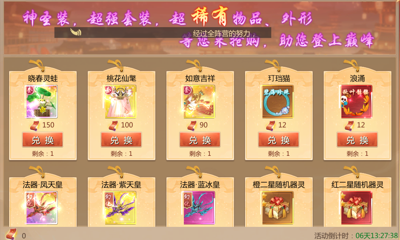 活动规则:活动期间可通过完成任务,充值等方式获取天命兑换卷,消耗兑换卷即可兑换稀有奖励!