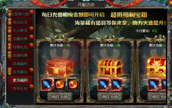 活动内容:在活动时间内,每日充值相应金额即可开启超级福利宝箱。
