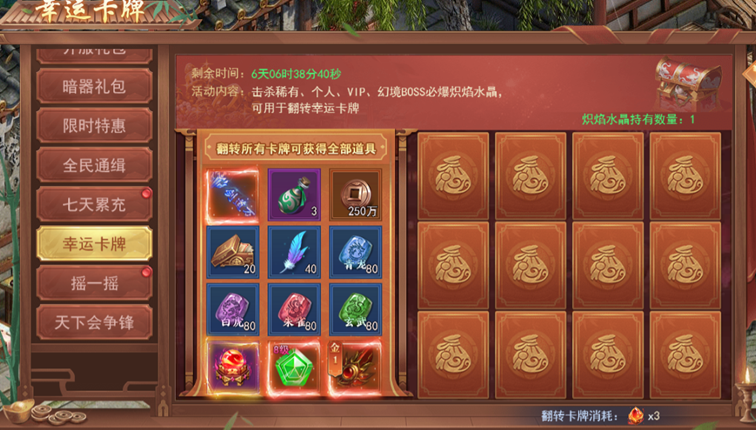 击杀稀有、个人、幻境boss必爆炽焰水晶,可翻转幸运卡牌获得各种珍惜道具奖励。