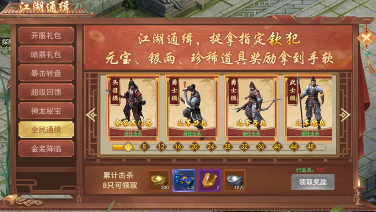 击杀指定怪物,元宝、银两、珍惜道具奖励拿到手软。