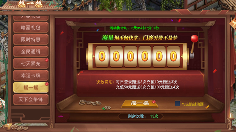 每日登陆赠送3次,充值10元赠送3次,充值50元赠送3次,充值100元赠送4次,海量铜币畅快拿,门客升阶不是梦。
