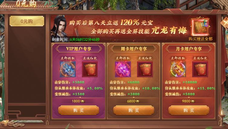 Vip用户、周卡、月卡用户可购买礼包,购买后第八天立返120%元宝,全部购买再送全屏技能亢龙有悔。