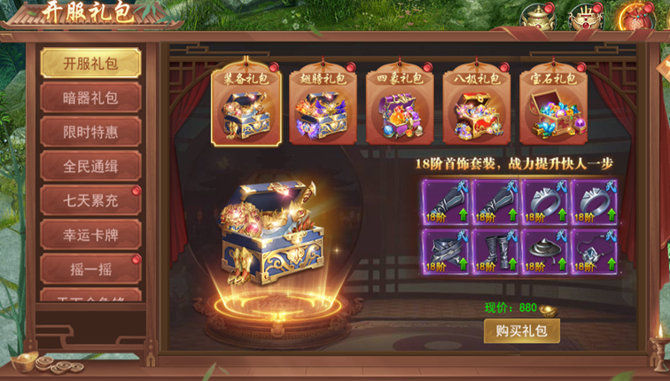 购买礼包战力飙升,打怪轻松。礼包有:装备礼包、翅膀礼包、四象礼包、八极礼包、宝石礼包、神装礼包。