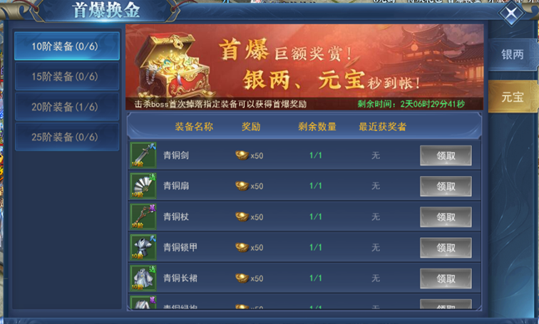 活动期间,率先击杀怪物爆出装备即可领取高额奖励,官方回收剑甲回收更有元宝奖励。