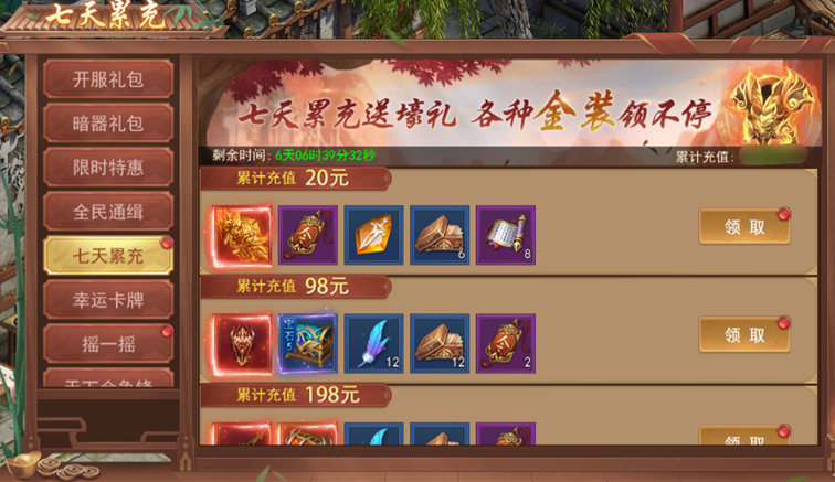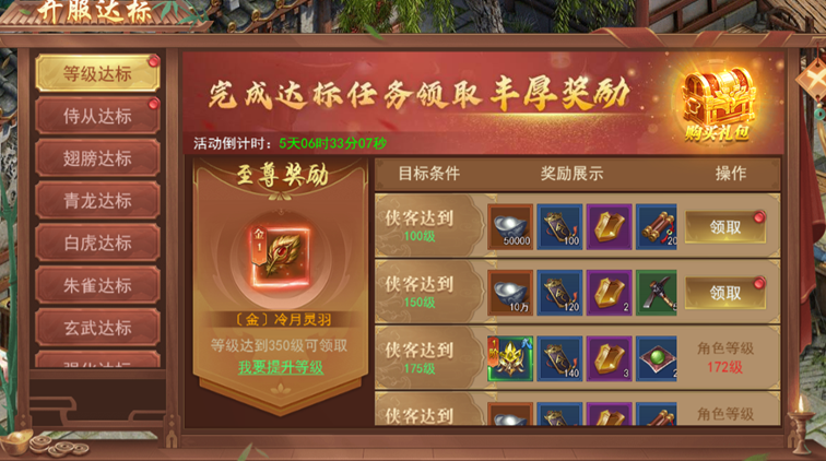 新服前6天每天开启不同的达标活动,活动持续6天,完成达标即可领取丰厚奖励。