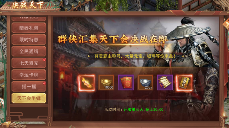 新服开服第三天20:00-20:30开启活动,决战天下会,尊贵称号等你来拿,还有大量元宝、银两等奖励。