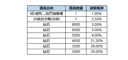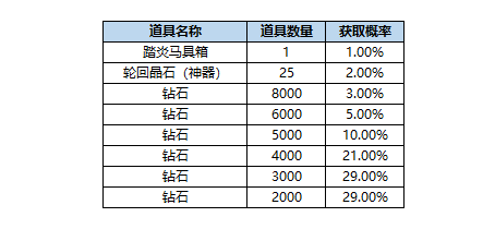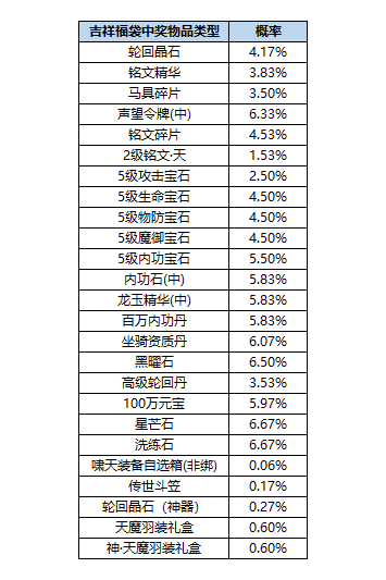 “豪华转盘”中,奖池由1个稀有奖池道具和19个普通奖池道具共计20个道具组成,物品产出概率公布如下: