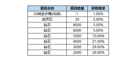 “转盘回馈”中,奖池由1个稀有奖池道具和9个普通奖池道具共计10个道具组成,物品产出概率公布如下: